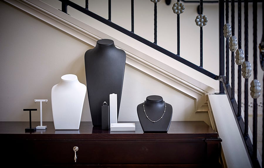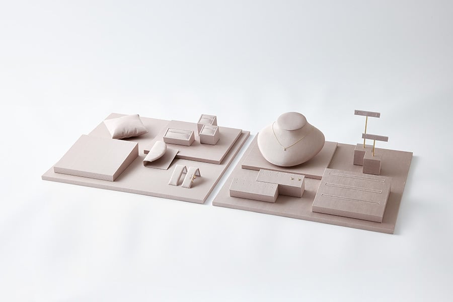 ジュエリー・アクセサリーショップ什器生地貼りシリーズ: 合皮・スェード調生地で仕上げたジュエリー用ディスプレイです。