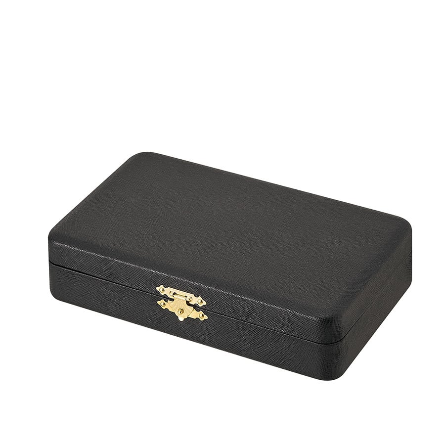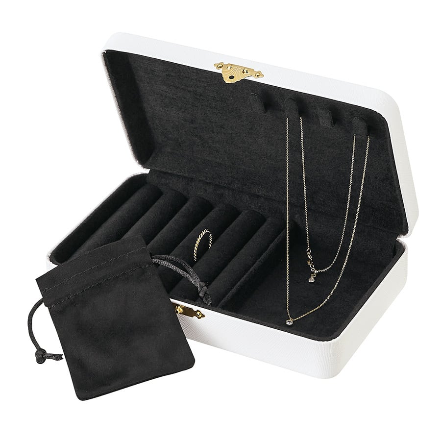 型番:AR-J170CA サイズ:177×114×41mm 素材:合成レザー 内装:スェード調 色:白・黒 外箱:ミ・フタ貼り箱付き(白色は外箱マット紙白・黒色は外箱マット紙黒) 左側台紙はリングの連差しのような仕様になっています。リングやピアスを差し込み収納します。 右側はフリースペースで巾着ポーチが1枚セットされます。 前金具がアンティーク風で非常に可愛いジュエリーボックスです。 ギフトボックスや販促ノベルティにも最適です。 納期:ご注文完了後約3日(営業稼働日)で発送させて頂きます。 リアルタイム在庫が変動している為、在庫切れの場合がございます。 予めご了承お願い致します。 在庫切れの場合は、納期を改めてご連絡させて頂きます。
