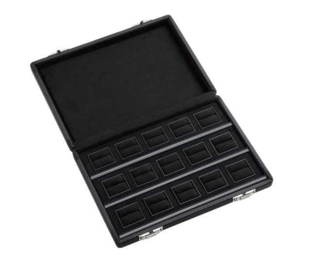 型番:AR-5427 サイズ:272×198×44mm 素材:外装生地:合成レザー 内装生地:スェード調 色:黒 リングが15個セットできるストックケースです。 プライスタグ止め付き 展示会や商談の際によく使用されています。 納期:ご注文完了後約3日(営業稼働日)で発送させて頂きます。 リアルタイム在庫が変動している為、在庫切れの場合がございます。 予めご了承お願い致します。 在庫切れの場合は、納期を改めてご連絡させて頂きます。