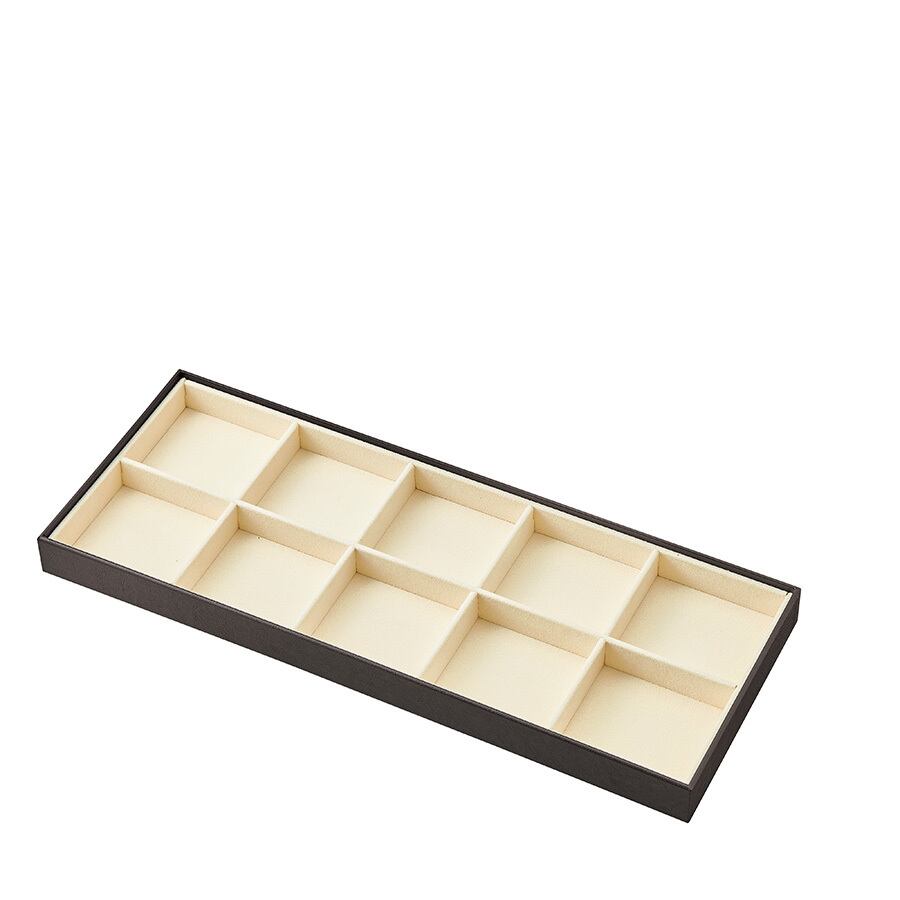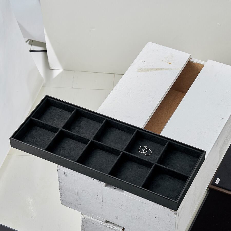 型番:AR-5600K サイズ:426×166×33mm 素材:外装生地:レザークロス 内装生地:スェード調 色:黒/黒・焦げ茶/アイボリー 耐久性のあるレザークロスと滑らかな手触りが特徴のスェード調生地を組み合わせたストックトレイシリーズです。 ダイヤモンドや地金が引き立つ黒色・パールや色石が引き立つ焦げ茶の2色よりお選びください。 納期:ご注文完了後約2日(営業稼働日)で発送させて頂きます。 リアルタイム在庫が変動している為、在庫切れの場合がございます。 予めご了承お願い致します。 在庫切れの場合は、納期を改めてご連絡させて頂きます。