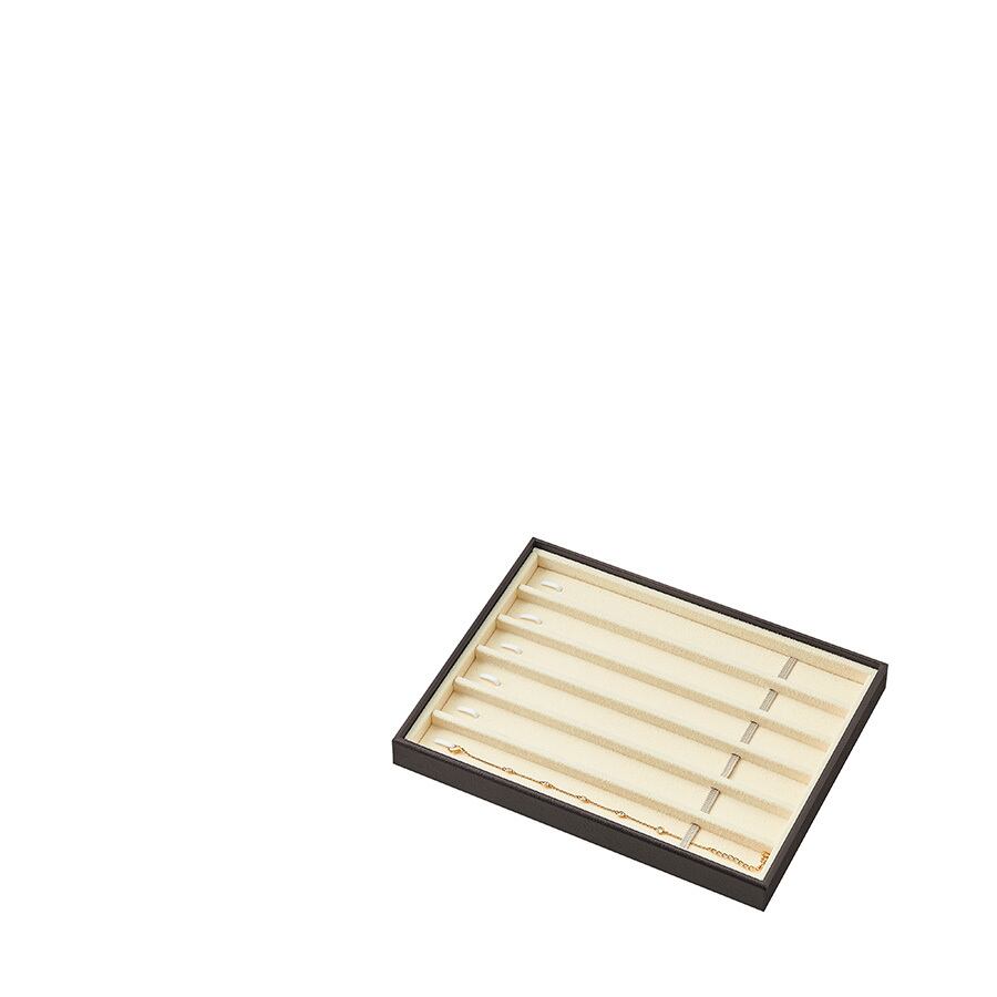 型番:AR-5600RH サイズ:212×164×43mm 素材:外装生地:レザークロス 内装生地:スェード調 色:黒/黒・焦げ茶/アイボリー 耐久性のあるレザークロスと滑らかな手触りが特徴のスェード調生地を組み合わせたストックトレイシリーズです。 ダイヤモンドや地金が引き立つ黒色・パールや色石が引き立つ焦げ茶の2色よりお選びください。 納期:ご注文完了後約2日(営業稼働日)で発送させて頂きます。 リアルタイム在庫が変動している為、在庫切れの場合がございます。 予めご了承お願い致します。 在庫切れの場合は、納期を改めてご連絡させて頂きます。