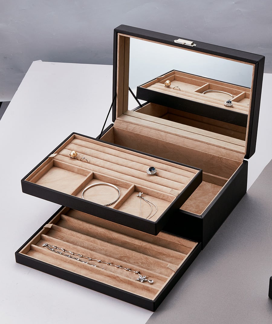 品番:459 用途:3段宝石箱(鍵付) 蓋内側ミラー 素材:合成レザー サイズ:300×208×106 カラー:黒 内側カラー:ベージュ 外箱:エンジ化粧紙カブセ式貼り箱 納期:ご注文完了後約2日(営業稼働日)で発送させて頂きます。 リアルタイム在庫が変動している為、在庫切れの場合がございます。 予めご了承お願い致します。 在庫切れの場合は、納期を改めてご連絡させて頂きます。