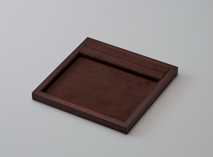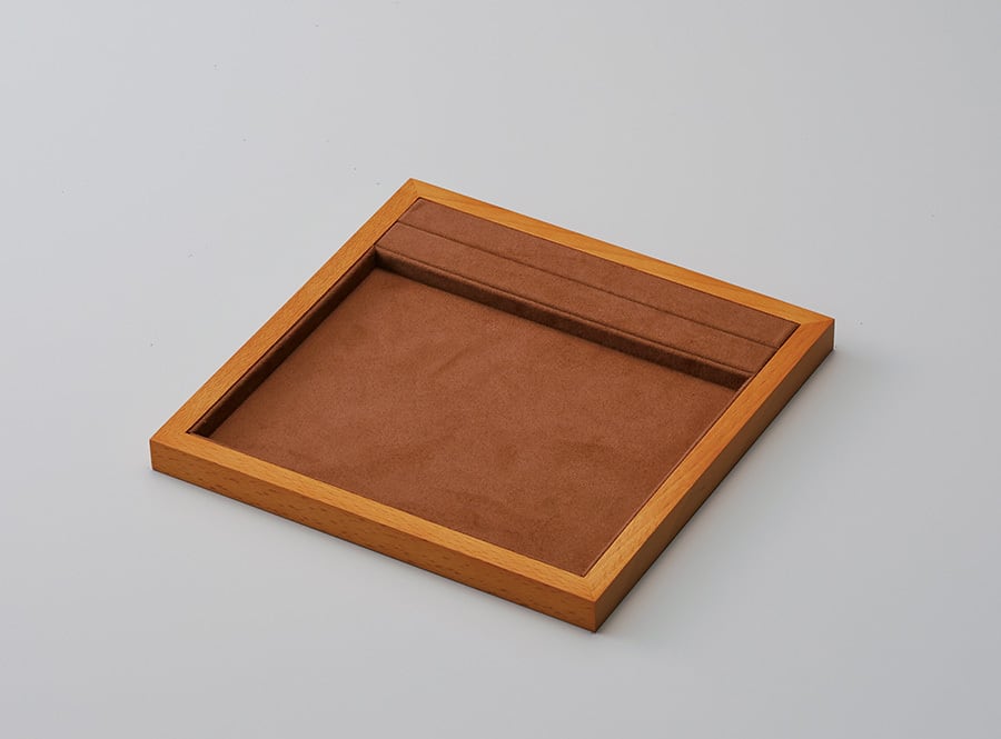 型番:AR-1546NW サイズ:200×200×15㎜ 材質:木枠(木製塗装)内装:スェード調生地 色:木枠部分チョコ・マロン・スミ(アンティーク塗装仕上げ) 木枠の接客トレイは他では中々見かけないトレイです。 ブランドイメージに合わせて製作されてはいかがでしょうか。 木枠部分は天然木工素材の為、若干の塗装の色ムラ、若干の凹み等が存在する場合がございますので、 予めご了承お願い致します。 ※こちらの商品は受注生産となります。納期は約3週間後の発送となります。 ご注文後に、改めて納期をご連絡させて頂きます。